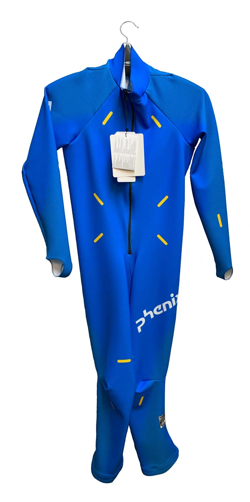 Norway Italy Race Suit GS Jr. with pads and FIS approval logo. Rare offering from Phenix to start offering an Italian model of their well know Norwegian one piece race suit design. The Italian model useses the exact same construction as the Norway model without all of the manufactures patches. Passes the 30ml FIS test – FIS Logo printed on left leg.